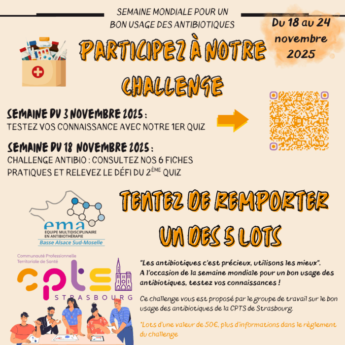 📢A l’occasion de la semaine mondiale pour un bon usage des antibiotiques ( 18 au 24 novembre 2025), la CPTS Strasbourg vous propose un challenge ludique et instructif ! 🎯Objectif :…